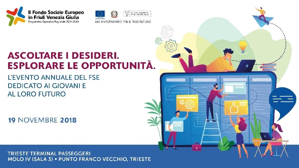 ASCOLTARE… COMPRENDERE… PROGRAMMARE. . . Ascoltare e analizzare i fabbisogni del tessuto sociale, del territorio e dell’intorno Comprendere le esigenze. Pianificare e programmare gli strumenti utili per valorizzare il capitale umano, (giovani, ma anche i cittadini di tutte le età). UNA PROGRAMMAZIONE CHE DA CENTRALITA’ AL FSE!