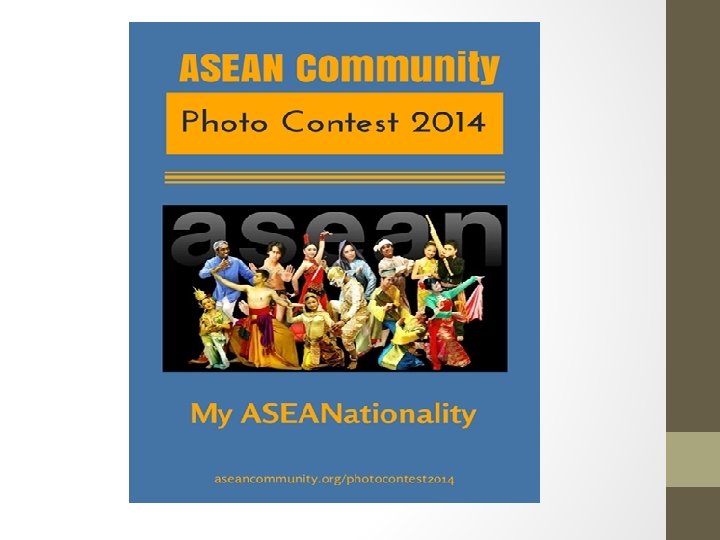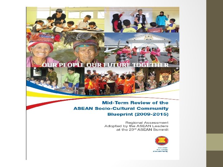 ��������� 2015 • The ASEAN Socio-Cultural Community’s primary goal and mission is to advance an ASEAN Community that puts people at its center and accords the highest value to learning, sharing, service, justice and the protection of rights; celebrates the region’s cultural wealth; extols prudent stewardship of natural resources; and is dedicated to enabling people to have access to opportunities to live and thrive in resilient, innovative and dynamic communities. Provisional Vision Statement, Second ASCC Working Group Meeting, Jakarta, 17 July 2014