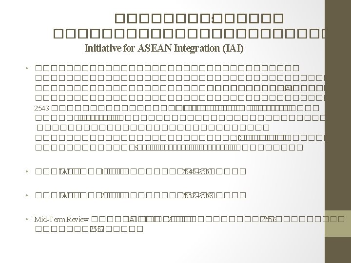 ����������� 2015 – ������� From Millennium Development Goals (MDGs) to Sustainable Development Goals (SDGs) to ASEAN Development Goals (ADGs)? ���������������������� Reframe/Update ASEAN Roadmap Towards Realizing the MDGs for addressing post-2015 priorities and challenges ���������������������� MDGs ��������������� 2015 Reframe/Update the Initiative for ASEAN Integration (IAI) Work Plan for post 2015 realities and issues ���������� IAI ��������������� 2015 Adjust ASEAN Framework on Equitable Economic Development (AFEED) to post-2015 circumstances ���������������������� IAI ���������� 2015 Realigning other relevant ASEAN frameworks/initiatives Incorporating relevant elements from the Bali Concord III Action Plan, 2013 -2017 �������������������������������������������� 3 �� 2556 -2560