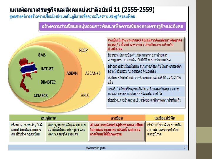 ����������� 2015 • ����� “The World We Want” ��������� 5 ���������� 2013 Report of UN SG’s High Level Panel of Eminent Persons on the Post-2015 Development Agenda 1. Leave No One Behind: ����������������� 2. Put Sustainable Development at the Core: ������������ 3. Transform Economies for Jobs & Inclusive Growth: �������������������������� 4. Build Peace & Effective, Open & Accountable Public Institutions: ������������������������� 5. Forge a New Global Partnership: ��������������� • ������ (ASEAN) “The ASEAN We Want” • ������ “The ASEAN Thailand Wants”