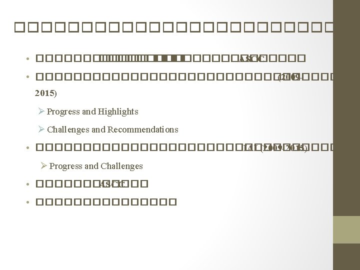 ����� – ����� • Prioritization within the ASCC Blueprint ������������������ • Enhancement of the ASCC monitoring tools ������������������ • Knowledge management system �������� • Coordination and cross-sectoral mechanisms ������������������ • Resource mobilization �������� • Multi-sectoral and multi-stakeholder participation ������������������ • Communication strategy ���������� • Special consideration for CLMV countries ����������������� ������