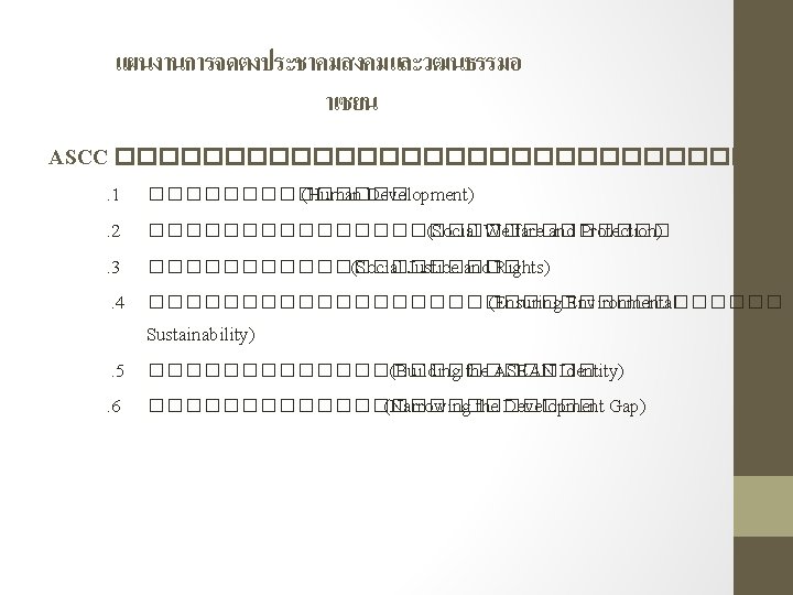 ������� �ASCC “The primary goal of the ASCC is to contribute to realizing an ASEAN community that is people-centred and socially responsible with a view to achieving enduring solidarity and unity among the nations and peoples of ASEAN by forging a common identity and building a caring and sharing society which is inclusive and harmonious where the wellbeing, livelihood, and welfare of the peoples are enhanced. ” (ASCC Blueprint 2009 -2015) ������������������� ������������������������������������������������������������