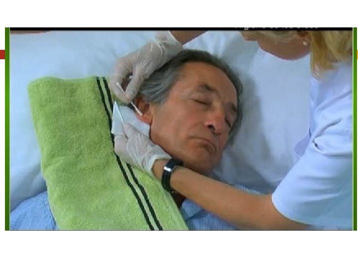 Procedimiento aseo de oídos externos ü Lavarse las manos, reunir material, informar. Colocar al paciente en posición semifowler y acomodar con la cabeza lateralizada. Humedecer una tórula y limpiar el pabellón de la oreja y región retroauricular, eliminar la tórula. Si hay secreción ótica empezar por el oído mas limpio o sano. Humedecer otra tórula y con movimientos de tirabuzón limpiar el conducto auditivo interno y eliminar. Limpiar las veces que sea necesario, al terminar dejar cómodo al pacte, lavarse las manos y registrar.