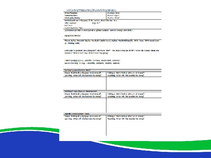 Siwrne Ddysgu DECHRAU • Amcanion yn glir gan gynnwys cyfeiriad at sgiliau • Ysgogiad • Cwestiynu/gweithgareddau sy’n cysylltu’n ôl i brofiadau/dysgu blaenorol C W E S T I Y N U DIWEDD Ymglymiad Gweithgareddau disgyblganolog ‘Cyflymder’ addas Dosbarth – grŵp – pâr Her Strategaethau dysgu amrywiol Clustnodi amser digonol i sicrhau bod y dysgwyr yn danogs: • beth maent wedi dysgu • ymwybyddiaeth o ba strategaethau dysgu maent wedi eu defnyddio • dealltwriaeth o ba mor effeithiol oedd eu dysgu. Myfyrio ar yr amcan(ion) dysgu/MPLL Trafod y cam nesaf yn y dysgu. Mwynhad Disgwyliadau uchel