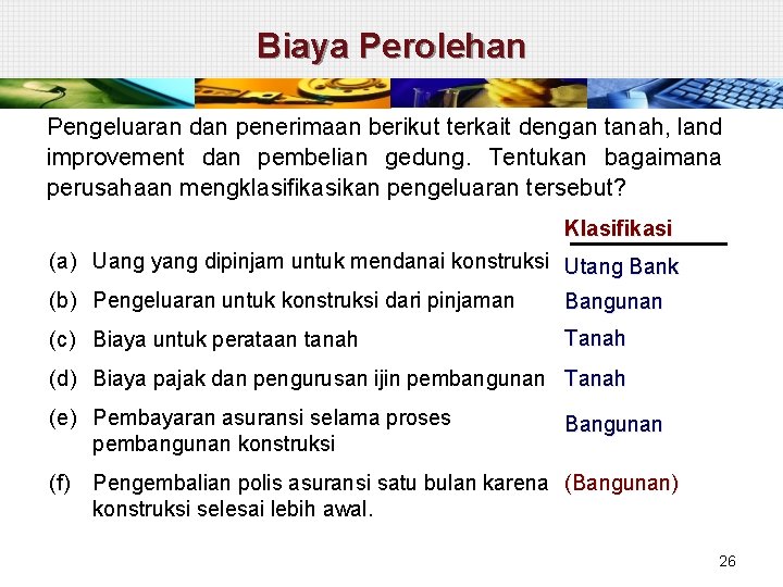 Perolehan Peralatan § Peralatan dapat meliputi mesin, kendaraan, peralatan kantor, peralatan pabrik dan peralatan lain. § Biaya perolehan meliputi (1) (2) (3) (4) (5) Harga beli, Pajak atau Bea yang tidak dapat dikreditkan Biaya transportasi Biaya asuransi selama pengiriman barang Biaya instalasi dan biaya penyiapan tempat untuk melakukan instalasi (6) Biaya untuk pengetesan peralatan 25