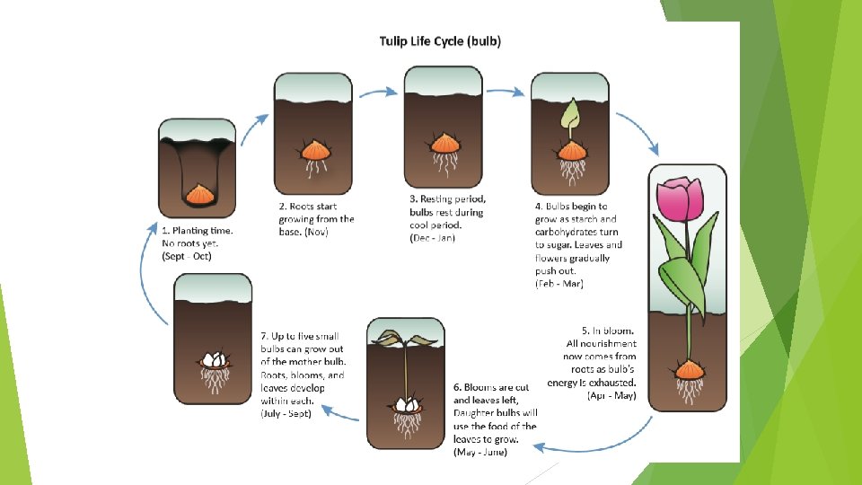 BULBS & CORMS Such as onions, garlic, hyacinths & daffodils. During the summer months the bulb becomes a food store and once the flower dies it stays safe and protected underground. In the spring the bulb begins to grow using the food store and can produce up to 5 new plants.