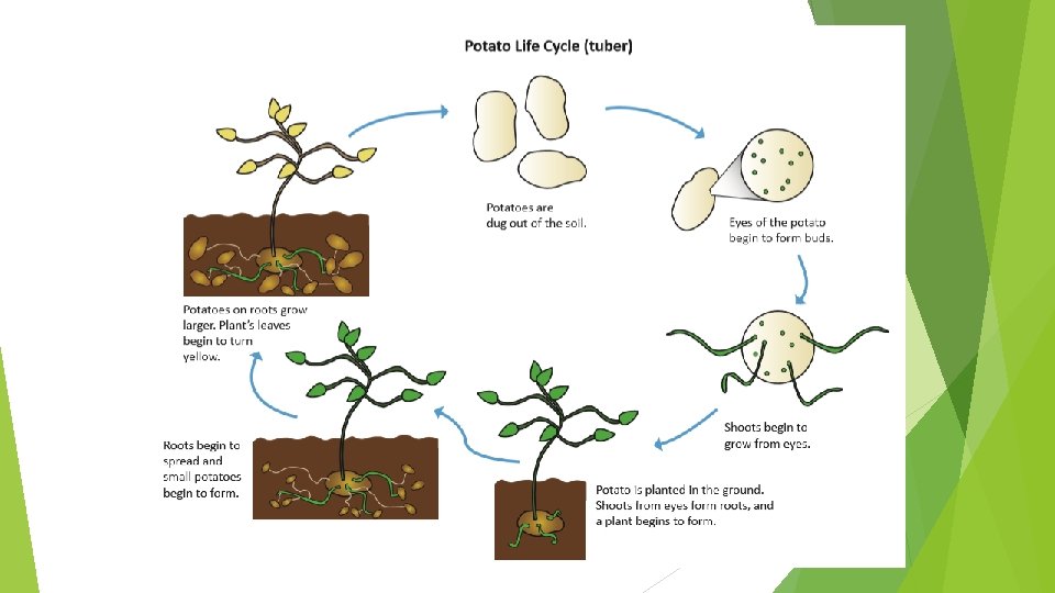 TUBERS Such as potatoes, sweet potatoes, yams and garlic. The eyes of the potato begin to sprout and grow into roots. If you plant this potato it will grow into a new plant and make lots of new potatoes.