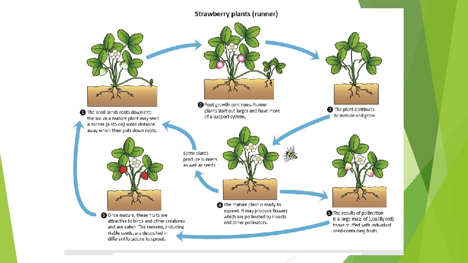 RUNNERS Such as strawberries, spider plants & mint The mother plant sends out horizontal stems in all directions. Where they touch the soil, they form roots and begin to grow into a new plant. The runners can also be called stolons.