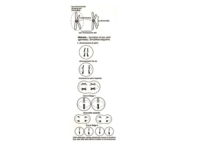 Differences between Mitosis and Meiosis Mitosis Meiosis • Occurs in somatic cells • One division during the process • Homologous chromosomes don’t pair off • Two cells formed • Centromere divides • Occurs in sex organs only • Two divisions during the process • Homologous chromosomes pair off • Four cells formed • Centromere divides at second division only • Daughter cells are haploid • Cells genetically different. • Daughter cells are diploid • Cells genetically identical