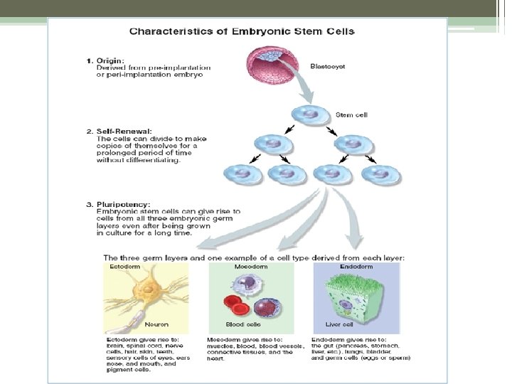 Stem Cells (embryonic or pluripotent) • Group of cells produced in early stages of the embryo’s growth • Similar to original zygote • Have the capability of becoming any type of cell • Genes within the cell can be turned off or turned on at specific time