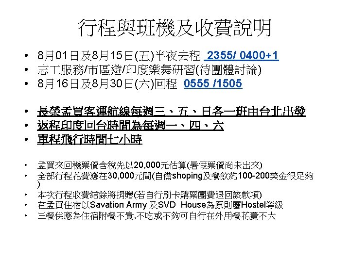 The Salvation Army Red Shield House Tel 2841824/ Fax 22824613 Email-red_shield@vsnl. net • 印度孟買Salvation Army住宿資料 • Check-in-10: 00 am Check-out-9: 00 am Double Room 600 with 3 meals Triple Room 897 with 3 meals A/C Room 891 with 3 meals (惟一有Hot water) Dormitory 150 with breakfast Family Room 297 with 3 meals Meal Timings Breakfast 7: 30 am-8: 45 am Lunch 12: 30 pm-2: 30 pm Dinner 7: 00 pm-8: 45 pm