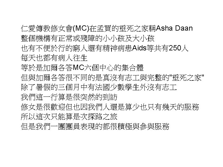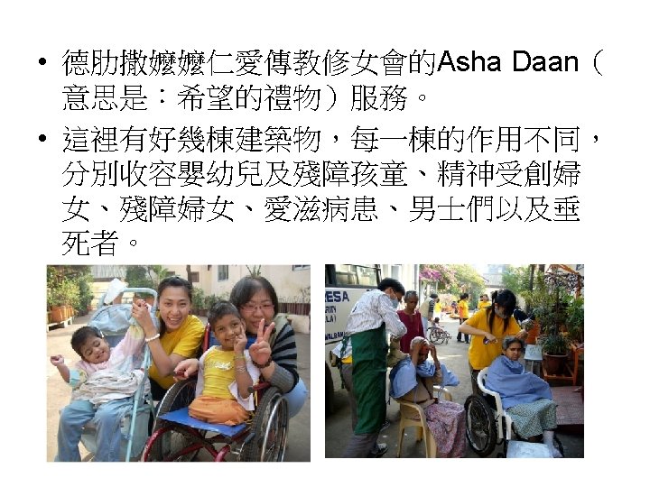 仁愛傳教修女會Asha Daan簡介 ASHA DAAN Missionaries of Charity Sankli Street Byculla Mumbai 400008 Tel: 23093591 Hindustan Lever supports Asha Daan run by the Missionaries of Charity (founded by the late Mother Teresa). It is a home for 300 abandoned, handicapped children, the destitute and people affected by AIDS (HIV positive). It has been set up on a 72, 500 square feet plot of warehouses of HLL also bears the capital and revenue expenses for maintenance, upkeep and security of the premises.