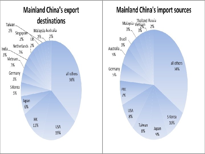 PRC’s Trade Partners • Japan is mainland China’s second largest trade partner and import source • Total trade volume nearly $1 bn per day • Total imports from Japan: US$166 billion – 9% of mainland China’s total imports • Total exports to Japan: US$137 billion – 6% of mainland China’s total exports