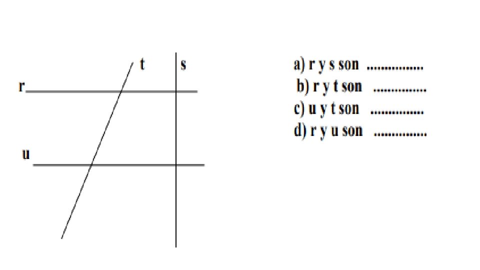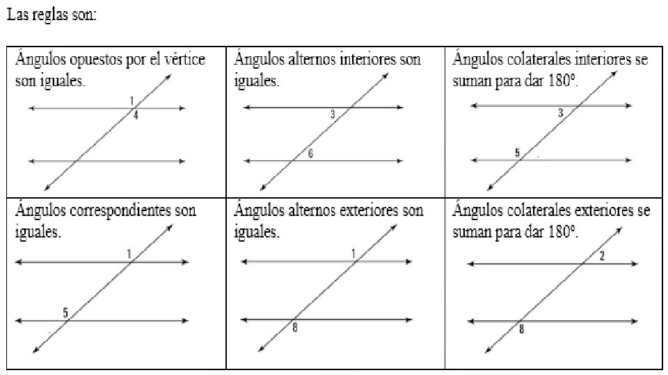 Ángulos formados al trazar una recta secante a dos paralelas. Los ángulos alternos internos: son los ángulos comprendidos dentro de las rectas paralelas, pero en lados diferentes de la secante. Son d y e, c y f. Los ángulos alternos externos: son los ángulos ubicados fuera de las rectas paralelas, pero en lados diferentes de la secante. Son a y g, h y b. Los ángulos colaterales internos y externos: son ángulos que están ubicados de un mismo lado de la secante. Son ángulos colaterales int. d y f, c y e, son ángulos colaterales ext. a y h, b y g. Los ángulos correspondientes: son ángulos que están en el "mismo lugar" con respecto a la transversal pero en diferentes rectas. Son a y f, d y h, b y e, c y g.