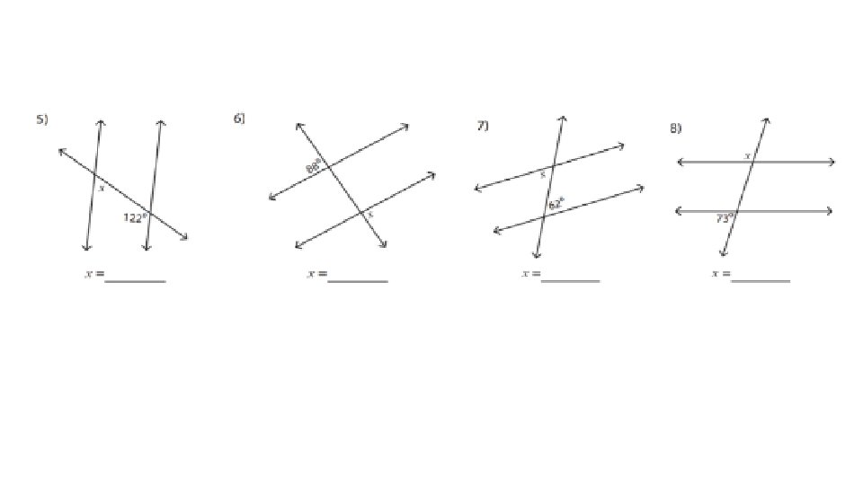 Ángulos colaterales externos Son aquellos que se encuentran del mismo lado de la secante y fuera de las rectas. Ejemplo: a y g se suman para dar 180 grados. b y h se suman para dar 180 grados.