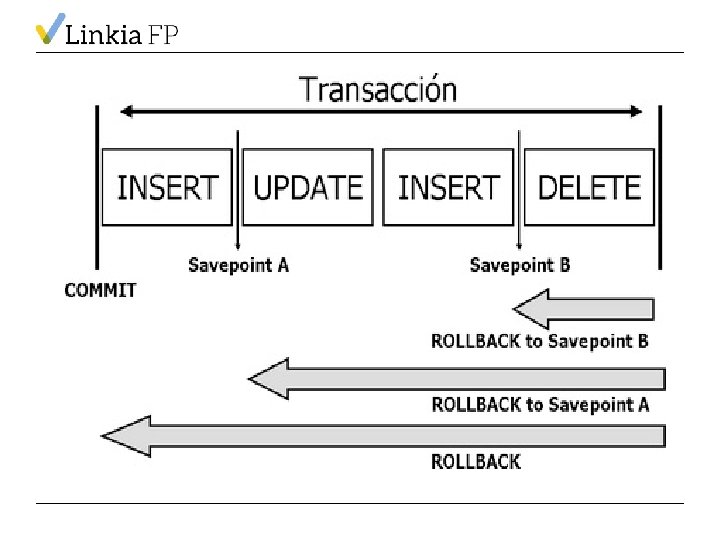 SAVEPOINT • Los SAVEPOINT son puntos de control que se sitúan dentro de una transacción. • Cuando se efectúa un ROLLBACK al final de una transacción, éste puede ser total (se deshacen todas las operaciones de la transacción) o hasta uno de los puntos de control de la transacción.