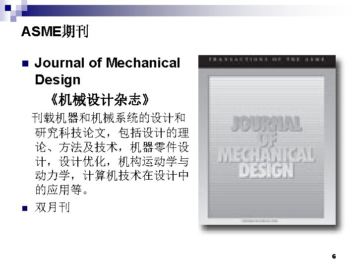 ASME期刊 期刊名称(英文) 期刊名称(中文) ISSN 出版频率 12 Journal of Heat Transfer 《传热杂志》 0022 -1481 6 13 Journal of Manufacturing Science and Engineering 《制造科学与 程杂志 》 1087 -1357 4 14 Journal of Mechanical Design 《机械设计杂志》 1050 -0472 6 15 Journal of Offshore Mechanics and Arctic Engineering 《海上机械与极地 程 杂志》 0892 -7219 4 16 Journal of Pressure Vessel Technology 《压力容器技术杂志》 0094 -9930 4 17 Journal of Solar Energy Engineering 《太阳能 程杂志》 0199 -6231 4 18 Journal of Tribology 《摩擦学杂志》 0742 -4787 4 19 Journal of Turbomachinery 《涡轮机械杂志》 0889 -504 X 4 20 Journal of Vibration and Acoustics 《振动与声学杂志》 1048 -9002 4 21 Journal of Fuel Cell Science and Technology 《燃料电池科学和技术 杂志》 1551 -6989 4 22 Journal of Medical Devices (New) 《医疗设备杂志》 4