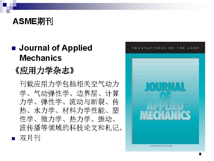 ASME期刊 期刊名称(英文) 期刊名称(中文) ISSN 出版频率 1 Applied Mechanics Reviews 《应用力学评论》 0003 -6900 6 2 Journal of Applied Mechanics 《应用力学杂志》 0021 -8936 6 3 Journal of Computational & Nonlinear Dynamics 《计算和非线性动力学杂志》 1555 -1415 4 4 Journal of Biomechanical Engineering 《生物机械 程学杂志》 0148 -0731 6 5 Journal of Computing and Information Science in Engineering 《 程计算与信息科学杂志》 1530 -9827 4 6 Journal of Dynamic Systems, Measurement and Control 《动力系统、测量与控制杂志 》 0022 -0434 4 7 Journal of Electronic Packaging 《电子封装杂志》 1043 -7398 4 8 Journal of Energy Resources Technology 《能源技术杂志》 0195 -0738 4 9 Journal of Engineering for Gas Turbines and Power 《燃气轮机与动力 程杂志》 0742 -4795 4 10 Journal of Engineering Materials and Technology 《 程材料与 艺杂志》 0094 -4289 4 11 Journal of Fluids Engineering 《流体 程学杂志》 0098 -2202 6 3
