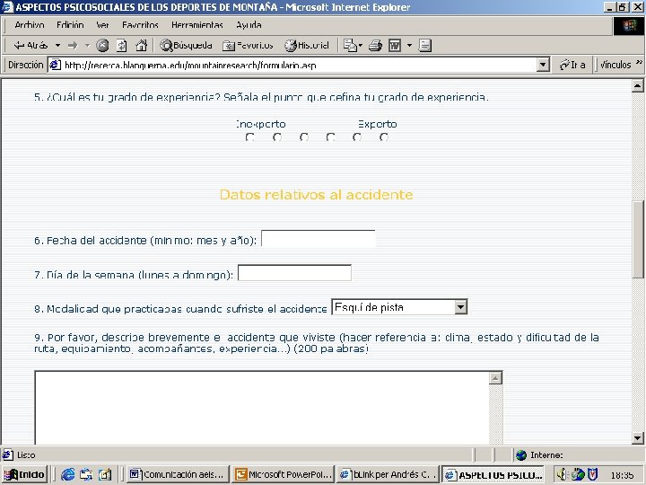 Objectius • Conèixer les causes dels accidents en la pràctica dels esports de muntanya en el nostre país de la perspectiva dels implicats: els accidentats. • Desenvolupar un instrument de recogida de dades on-line. • Introduïr metodologia qualitativa en l’análisi de l’accidentalitat. • Realitzar aportacions a la implantació d’una cultura de la muntanya basada en la seguretat.