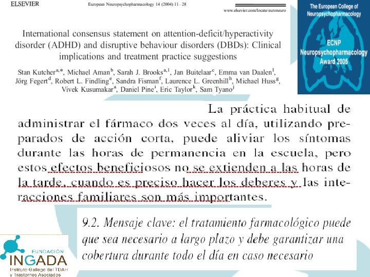 EVIDENCIAS CIENTIFICAS QUE APOYAN TRATAMIENTO MULTIMODAL: GPC y Consensus Internacionales • NICE -National Insitute for Health and Clinical Excellence(Reino Unido). 2008 • SIGN- Scotish Intercollegiates Guidelines Network. 2001 • AACAP-American Academy of Child and Adolescent Psychiatry (EE. UU. ) 1997/ rev. 2007. • CCHMC- Cincinnati Children´s Hospital Medical Center (EE. UU. ). 2004. • European Clinical Guidelines for hyperkinetic disorder, 2004: European Network for Hyperkinetic Disorders/ ESCAP (European Society for Child and Adolescent Psychiatry). • Global consensus on ADHD/HKD, 2005.
