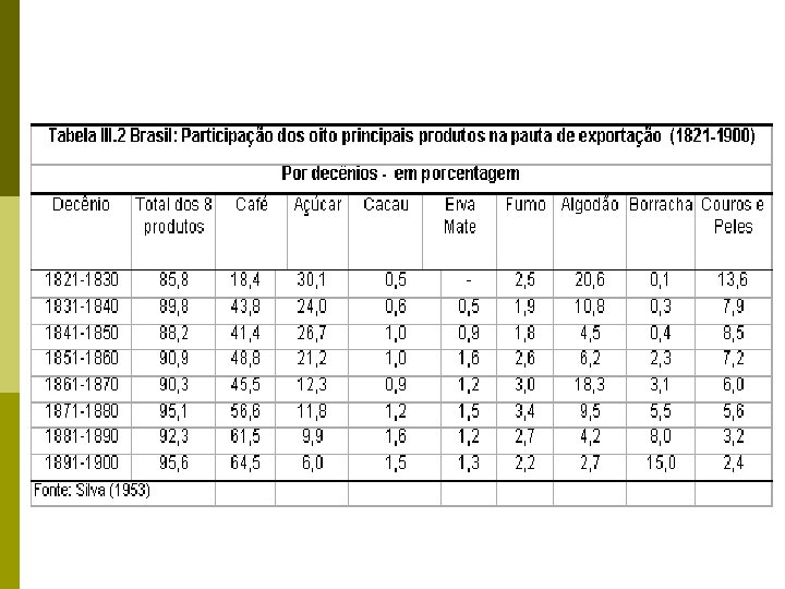 Tabela III. 1. Brasil: Expansão da Produção Cafeeira (1821 -1900) Média decenal - mil sacas/ano Anos Produção 1821/1830 300 1831/1840 1000 1841/1850 1700 1851/1860 2600 1961/1870 2900 1871/1880 3600 1881/1890 5300 1891/1900 7200 Fonte: Silva (1986)