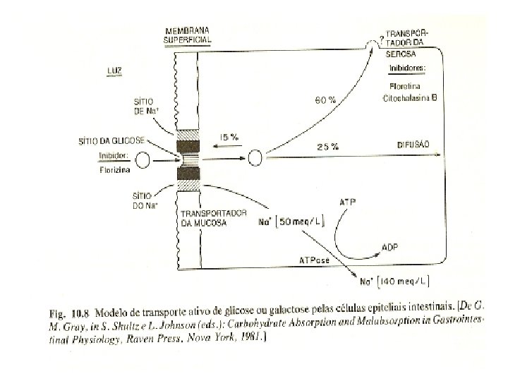 Comentário • O slide anterior mostra domínios de membrana de nossas células que por serem diferentes entre si, indicam que não podemos ter raciocínios simplistas. As proteínas da região luminal interagem componentes do intracelular e do meio externo ou seja, de “fora do organismo” ( Luz intestinal no aparelho digestório ou local onde se forma a urina nos túbulos dos nefrons dos rins). As proteínas da membrana baso-lateral interagem com intracelular e com o extracelular do nosso meio interno (local da homeostasia). Este aspecto será fundamental para se entender como pode haver perda de K (potássio) quando o plasma sanguíneo possui níveis perigosamente baixos de potássio circulante (causando fibrilação cardíaca e morte). A proteína da face luminal interage com níveis altos de potássio do intracelular mesmo em níveis de hipocalemia ( baixo potássio sanguíneo). Responda qual o motivo de termos apetite específico para sódio (linha de pesquisa do Prof. Miguel R. Covian) e não para o potássio? • Se o sódio for completamente suprimido da dieta sua concentração na urina vai sendo diminuída até que este cátion não seja detectado na urina. Por outro lado, se fizermos uma redução de potássio na dieta (algo muito difícil de ser feito pois, ele é o cátion do intracelular de todos os seres vivos que é o que compõe majoritariamente uma dieta normal) o potássio sofrerá uma redução de sua concentração urinária sem desaparecer da urina. Posteriormente, morte por parada cardíaca. Qual a razão para esta diferença na regulação destes dois cátions. ? Que paralelo pode ser traçado entre os níveis de potássio na urina e com a incapacidade que temos de curar a Galactosemia com a eliminação da Galactose da dieta? Quando o Prof. Leloir explicou o motivo de estudar em leveduras a ativação da molécula de glicose para produção de glicogênio (formação de UDPG) e assim, encontrar o mecanismo de produção de galactose (UDPGal) e lactose a partir de glicose, destacou pensar na mesma reatividade química comum que deveria estar presente no início do processo de surgimento da vida e portanto, na possibilidade de mecanismos idênticos que se confirmaram mas, não em determinismo genético. •