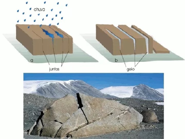 INTEMPERISMO FÍSICO Ocorre por meio de processos físicos, com a fragmentação das rochas formando assim diversos tipos de sedimentos (por exemplo, a areia). É influenciado sobretudo, pela variação de temperatura( dilatação e congelamento) e de pressão. Com isso, o processo de dilatação das rochas, favorece sua fragmentação.