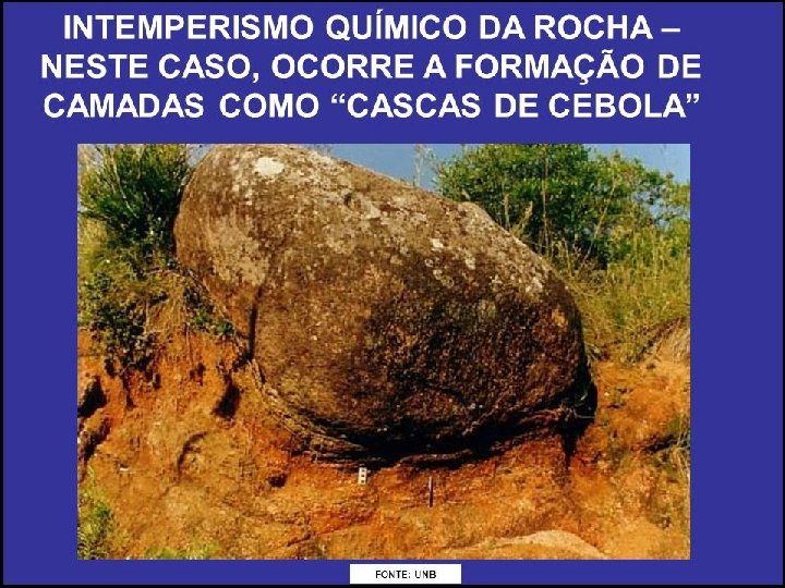 INTEMPERISMO QUÍMICO Acontece por meio de reações químicas que ocorrem principalmente através da ação da água e da temperatura, o intemperismo químico resulta nas alterações e transformação dos minerais, alterando assim, a composição química das rochas.