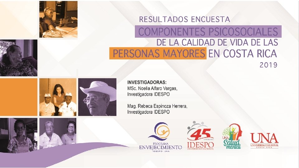 Fecha de encuesta Tamaño de la muestra Del sábado 1 hasta el domingo 30 de junio del 2019 603 personas Modalidad de la entrevista Tipo de muestreo de teléfonos Telefonía fija residencial Población de estudio Personas de 60 años y más residentes en el país Muestreo por cuotas controlada por Sexo. Marco muestral: las listas de telefonía fija del año 2019 ICE. Margen de error 4% Nivel de confianza 95% Respuestas de la población de estudio Modo vivir, expectativas, placeres y preocupaciones.
