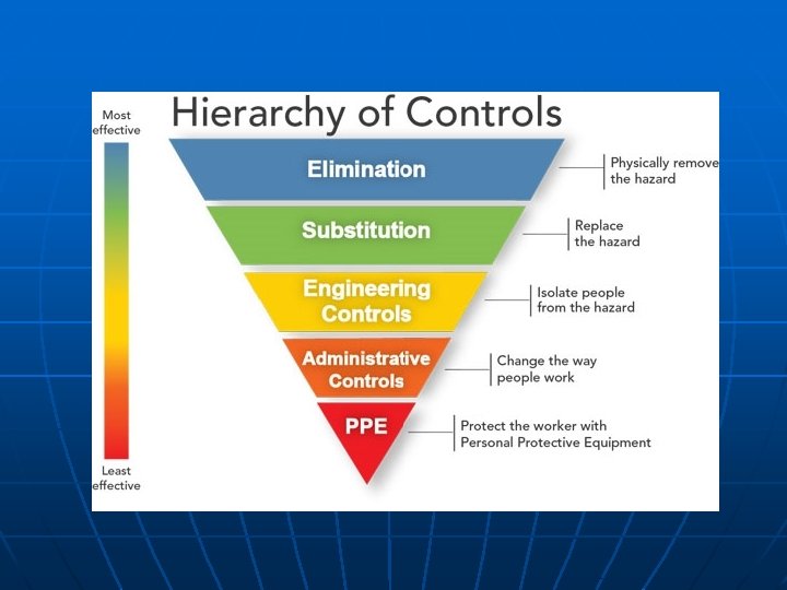 PRINSIP PENGENDALIAN BAHAYA n n Penggantian/substitution, dikenal sebagai engineering control. Pemisahan/separation • • • Pemisahan fisik/physical separation Pemisahan waktu/time separation Pemisahan jarak/distance separation n Ventilasi/ventilation Pengendalian administratif/administrative n Perlengkapan perlindungan personnel/ n controls Personnel Protective Equipment/ PPE