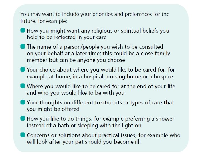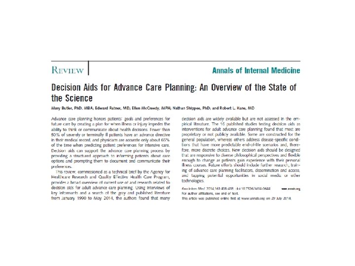 Decision aids multimediali • www. makingyourwishesknown. com sviluppato da Green e Levi; copyright di Pennsylvania State University • www. mydirectives. com fondato da Brown e Zucker, “is the first medical directives platform to receive meaningful-use certification from the U. S. Department of Health and Human Services” • https: //prepareforyourcare. org/ autore e direttore del programma Sudore; copyright di The Regents of the University of California