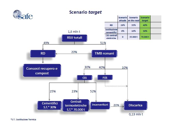 CONCLUSIONI DI UN MASTER SU ROMA • Diversi Paesi europei hanno un efficace sistema di gestione dei RSU. L’Italia, nonostante non sia tra i paesi più virtuosi per quanto riguarda la gestione dei RSU, non ricorre a sufficienza al co-incenerimento • Utilizzando il CSS e incrementando la RD al 49%, Roma diventerebbe potenzialmente autonoma riuscendo a trattare l’indifferenziato esclusivamente in impianti TMB. Questo comporterebbe dei risparmi per il comune di Roma e un incremento delle emissioni evitate di CO 2 • Il ricorso al CSS nel ciclo di gestione contribuirebbe a ridurre lo smaltimento in discarica di tre volte rispetto ad uno scenario caratterizzato da sola RD • Inoltre, ricorrendo alla gestione integrata, si ridurrebbe al minimo il ricorso alla discarica, sebbene non lo si possa annullare totalmente • Gli scenari proposti evidenziano come il CSS possa essere un’occasione per il comune di Roma di valorizzare le risorse disponibili. . . e se si applicassero su scala nazionale!