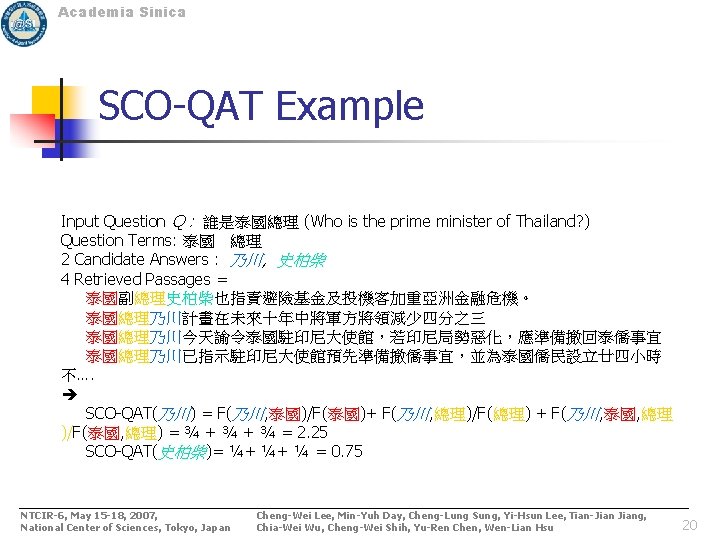 Academia Sinica SCO-QAT (Sum of Co-occurrence of Question and Answer Terms) NTCIR-6, May 15 -18, 2007, National Center of Sciences, Tokyo, Japan Cheng-Wei Lee, Min-Yuh Day, Cheng-Lung Sung, Yi-Hsun Lee, Tian-Jiang, Chia-Wei Wu, Cheng-Wei Shih, Yu-Ren Chen, Wen-Lian Hsu 19
