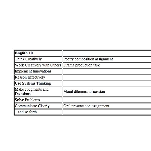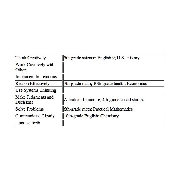 21 st-Century Skills English language arts World languages Arts Mathematics Economics Science Geography History Government and Civics Global Awareness Business Literacy Civic Literacy Health Literacy Think Creatively Work Creatively with Others Implement Innovations Reason Effectively Use Systems Thinking Make Judgments and Decisions Solve Problems Communicate Clearly Collaborate with Others Access and Evaluate Information Use and Manage Information Analyze Media Create Media Products Apply Technology Effectively Adapt to Change Be Flexible Manage Goals and Time Work Independently Be Self-directed Learners Interact Effectively with Others Work Effectively in Diverse Teams Manage Projects Produce Results Guide and Lead Others Be Responsible to Others