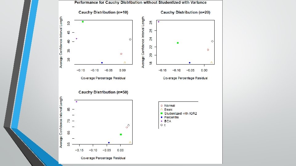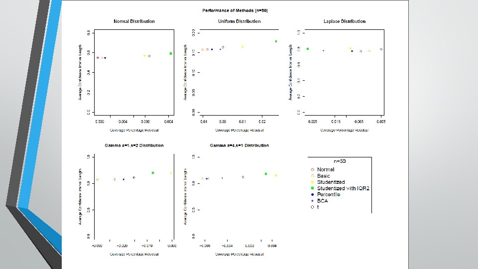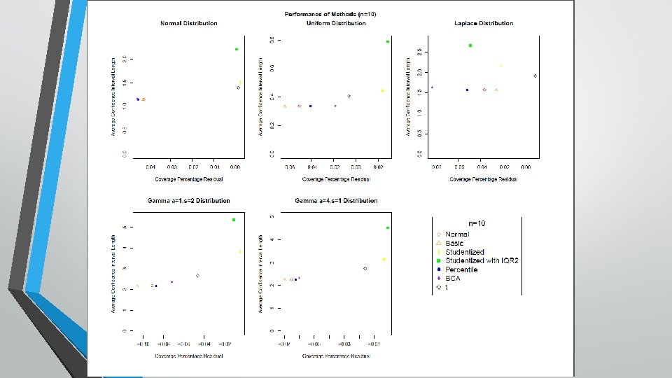 Average CI Length for Mean (n=10) 6. 000 5. 000 4. 000 3. 000 2. 000 1. 000 0. 000 Normal Uniform Normal CI Length Normal Uniform Cauchy Laplace Gamma a=1, s=2 Gamma a=4, s=1 n 10 10 10 Basic CI Length Normal CI Length 1. 145 0. 334 33. 342 1. 573 2. 190 2. 247 Laplace Studentized CI Length Basic CI Length 1. 144 0. 334 28. 431 1. 568 2. 164 2. 239 Studentized with IQR 2 CI Length Studentized CI Length 1. 505 0. 444 180321. 919 2. 155 3. 819 3. 143 Gamma a=1, s=2 Percentile CI Length Gamma a=4, s=1 BCA CI Length Studentized with IQR 2 CI Length Percentile CI Length 2. 205 1. 144 0. 789 0. 334 50. 848 28. 431 2. 665 1. 568 5. 361 2. 164 4. 518 2. 239 t CI Length BCA CI Length 1. 164 0. 337 41. 633 1. 635 2. 358 2. 321 t CI Length 1. 393 0. 407 41. 239 1. 915 2. 666 2. 734