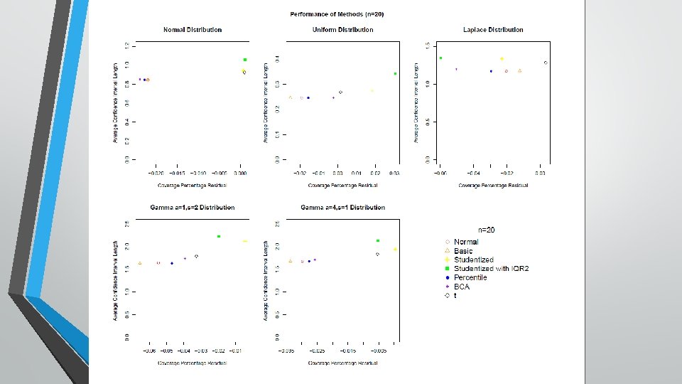 Coverage for Mean (n=20) Coverage for Means (n=20) 0. 0500 0. 0000 Normal Uniform Cauchy Laplace Gamma a=1, s=2 Gamma a=4, s=1 -0. 0500 Normal Uniform Cauchy Laplace Gamma a=1, s=2 Gamma a=4, s=1 -0. 1000 Normal Uniform Cauchy Laplace Gamma a=1, s=2 Gamma a=4, s=1 -0. 1500 -0. 2000 Normal Basic Studentized with IQR 2 Percentile BCA t Studentized with IQR 2 Percentile n Normal Basic BCA t 20 20 0. 9281 0. 9309 0. 9634 0. 9297 0. 9280 0. 9250 0. 9760 0. 9377 0. 9507 0. 9683 0. 9016 0. 9270 0. 9511 0. 9805 0. 8548 0. 8903 0. 9273 0. 9344 0. 8975 0. 9205 0. 9262 0. 9478 0. 7858 0. 8997 0. 9510 0. 9515 0. 9788 0. 9533 20 0. 8953 0. 8846 0. 9455 0. 9303 0. 9031 0. 9107 0. 9173 20 0. 9202 0. 9163 0. 9504 0. 9447 0. 9224 0. 9243 0. 9446 n Normal Basic BCA t 20 20 -0. 0219 -0. 0191 0. 0134 -0. 0203 -0. 0220 -0. 0250 0. 0260 -0. 0123 0. 0007 0. 0183 -0. 0484 -0. 0230 0. 0011 0. 0305 -0. 0952 -0. 0597 -0. 0227 -0. 0156 -0. 0525 -0. 0295 -0. 0238 -0. 0022 -0. 1642 -0. 0503 0. 0010 0. 0015 0. 0288 0. 0033 20 -0. 0547 -0. 0654 -0. 0045 -0. 0197 -0. 0469 -0. 0393 -0. 0327 20 -0. 0298 -0. 0337 0. 0004 -0. 0053 -0. 0276 -0. 0257 -0. 0054 Studentized with IQR 2 Percentile