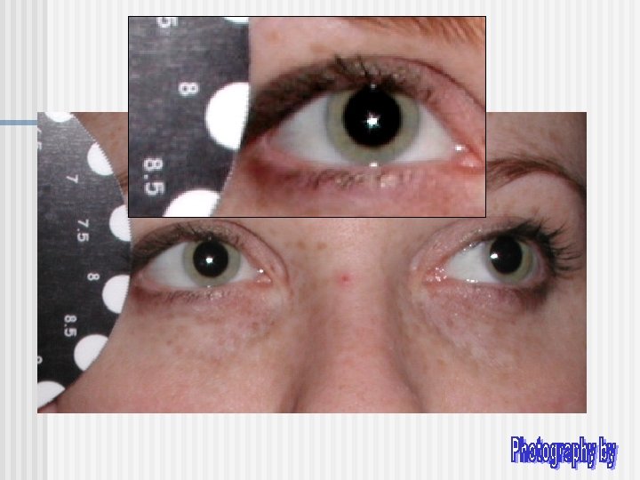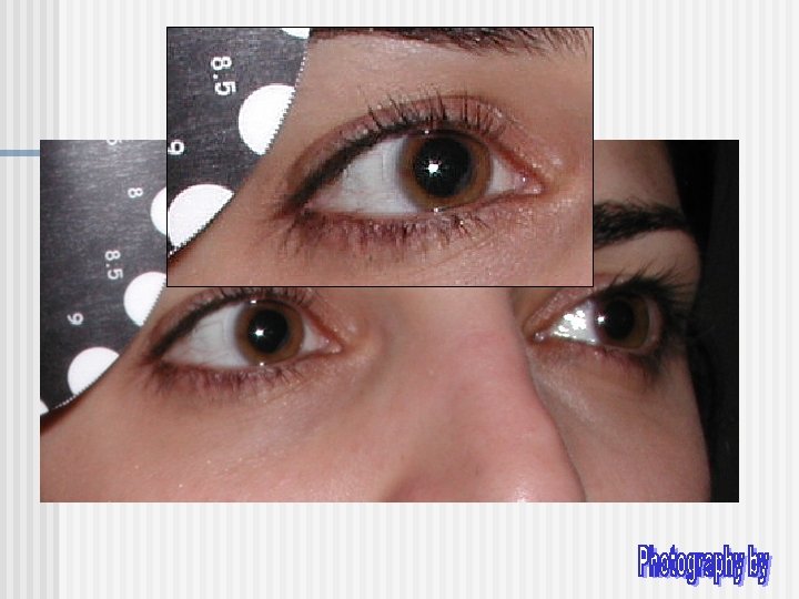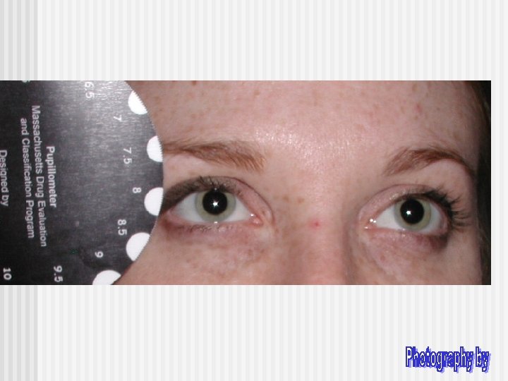 Pupil Size Ranges n Room Light: n n n Near Total Darkness: n n n Average – 4. 0 mm Range for majority of subjects – 2. 5 mm to 5. 0 mm Average – 6. 5 mm Range for majority of subjects – 5. 0 mm to 8. 5 mm Direct Light: n n Average – 3. 0 mm Range for majority of subjects – 2. 0 mm to 4. 5 mm