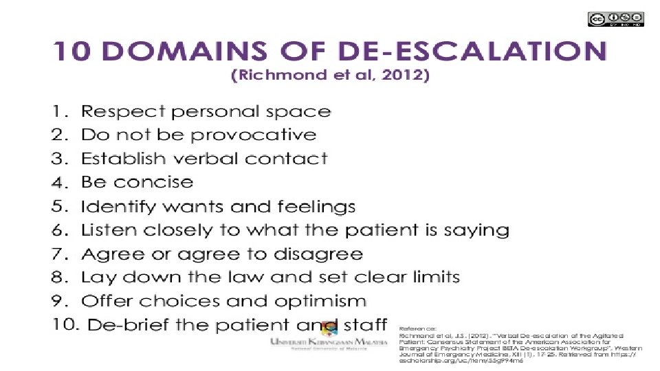 Communication-based de-escalation techniques Ø Communication Ø Nonverbal Ø Maintain a safe distance. Ø Maintain a neutral posture. Ø Do not stare; eye contact should convey sincerity. Ø Do not touch the patient. Ø Stay at the same height as the patient. Ø Avoid sudden movements. Ø Verbal Ø Speak in a clam & clear tone. Ø Personalize yourself. Ø Avoid confrontation; offer to solve the problem. Ø Tactics Ø Debunking Ø Acknowledge the patient’s grievance. Ø Acknowledge the patient’s frustration. Ø Shift focus to discussion of how to solve the problem. Ø Aligning goals Ø Emphasize common ground. Ø Focus on the big picture. Ø Monitoring Ø Be acutely aware of progress. Ø Know when to disengage. Ø Do not insist on having the last word.