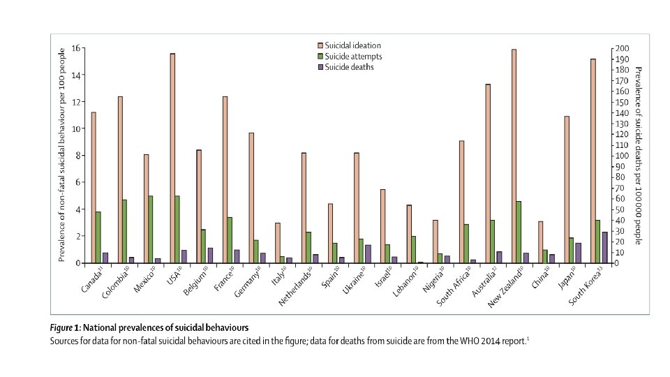 Epidemiology Ø Globally, an estimated 11. 4/100, 000 people commit suicides every year, resulting in 804, 000 deaths. Ø Individuals who reports suicide ideation with pervious 12 months have significantly higher 12 - months prevalence rates of suicide attempts (15. 1% in high-income countries and 20. 2% in low-income countries) Ø Suicide is the second leading cause of death in individuals age 15 -29 years. Ø Suicide rates very within and between countries, with as much as a tentimes difference between regions; this variation is partly correlated with economic status and cultural differences. Ø Cultural influences might TRUMP geographic location, because the suicide rates of immigrants are more closely correlated with their country of origin than with their adoptive country.