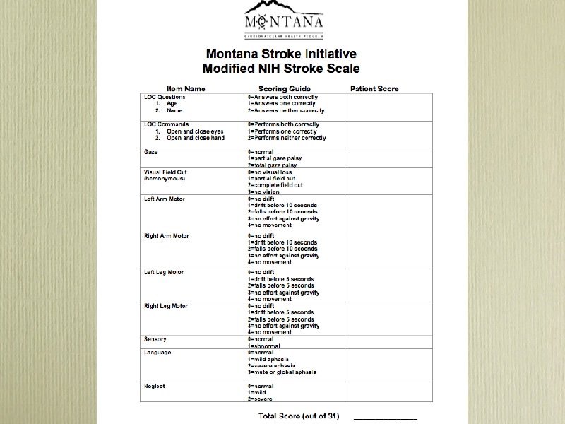 Modified NIH Stroke Scale • Quantified neurologic exam • Points added for each deficit (max=31) • Hi score= severe deficits or big stroke • Predicts: 1. outcome 2. success from thrombolysis 3. disposition