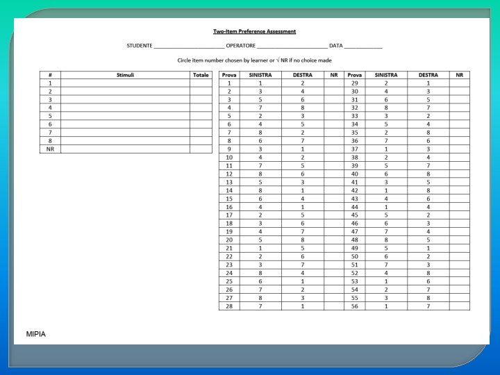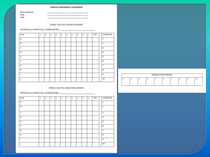 � Il terapista presenta un insieme di oggetti per un tempo fisso, di solito di 5 minuti. � Osservare per intervalli da 10 secondi usando un partial interval registrando con quali oggetti il soggetto interagisce. � I dati sono sommati in base ad una percentuale � Viene creata una scala di preferenze in base alle scelte � Visto che non vi è restrizione all’accesso degli item, previene possibili comportamenti problema Roane, Vollmer, Rindahl, Marcus (1998)