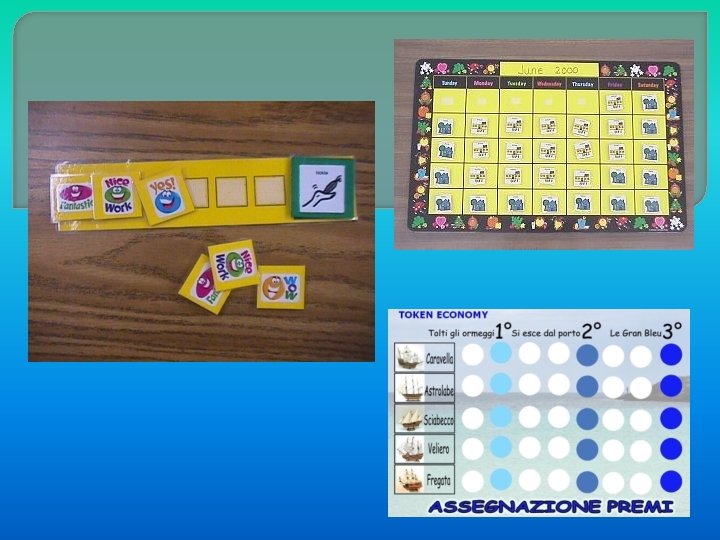 1) 2) 3) Identificare l’obiettivo e le regole. Scegliere dei token adeguati (immagini preferite) Selezionare un elenco ricco di rinforzatori di sostegno (negozio, l’autodeterminazione e quindi la scelta è gia’ un rinforzo) 4) 5) 6) Stabilire un rapporto di cambio tra numero di token e rinforzatori di sostegno. Definire procedure per specificare quando e come i token verranno dispensati e scambiati (prima giornalieri e poi settimanali), e che cosa accadrà se i requisiti per guadagnare un token non sono soddisfatti. Registrare il comportamento, raccogliere dati.