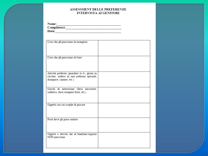 l’ ambiente è organizzato con tanti contenitori trasparenti � gli oggetti sono divisi per categoria � sono presenti una varietà di materiali per ogni categoria � i giochi sono posizionati in modo da non essere direttamente accessibili al bambino ma forniti dall’operatore (controllo da parte dell’operatore) � l’operatore ha individuato i giochi o le attività preferite dal bambino � l’operatore toglie gli elementi distraenti � l’operatore osserva il comportamento non verbale del bambino (avvicinarsi, sguardo, etc) � l’operatore aumenta gradualmente il contatto oculare, la vicinanza e la durata dell’interazione �