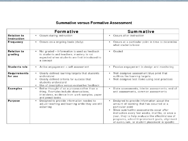 Types of assessment O Diagnostic: occurs prior to instruction O Formative: informal; happens throughout the day, every school day; looks at students’ formation of knowledge, skills, concepts, etc. O Authentic/Performance: Resemble tasks that occur outside the classroom O Summative: summarizes student learning; closely tied to grades