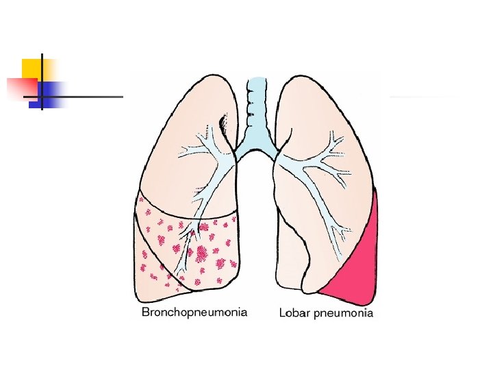 Pneumonia n Inflammation & infection of lunginfecting organisms typically inhaledorganisms transmitted to lower airways and alveoli causing inflammation- impairs gas exchange Etiology: bacteria, virus, Mycoplasma, fungus, or from aspiration or inhalation of chemicals or other toxic substances n Risk factors: cigarette smoking, chronic underlying disorders, severe acute illness, suppressed immune system, & immobility