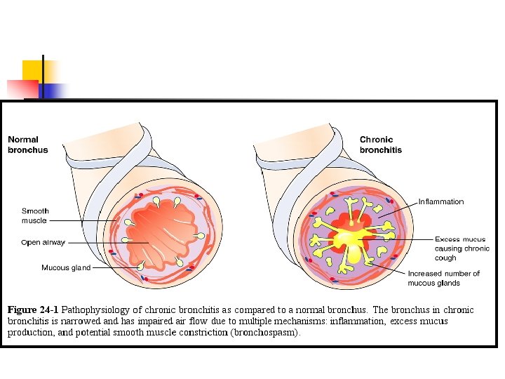 Bronchitis n n n Inflammation of the bronchi caused by irritants or infection hypertrophy & hypersecretion of mucous- cause increase in sputum production increase mucous- decrease airway lumen sizelumen becomes colonized with bacteria. Bronchial wall becomes scarred - leads to stenosis & airway obstruction Defined as a productive cough that lasts 3 months a year for 2 consecutive years with other causes excluded. Cough in the morning with sputum production is indicative of Chronic Bronchitis
