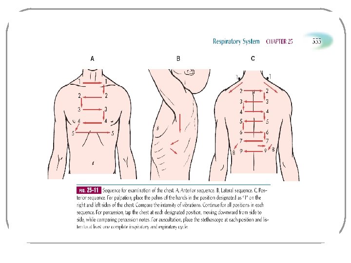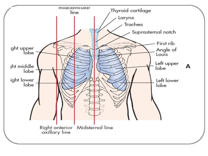 Outlines l l l l anatomy and physiology of respiratory system Assessment of respiratory system ] 1 Position/Lighting/Draping 2 Inspection • • 2. 1 Chest wall deformities 2. 2 Signs of respiratory distress • 5. 1 Vocal fremitus (not usually done) 3 Palpation 4 Percussion 5 Ausculation l
