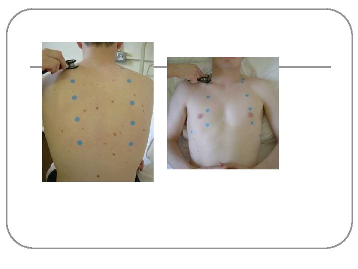 Position/Lighting/Draping l l l Position – patient should sit upright on the examination table. The patient's hands should remain at their sides. When the back is examined the patient is usually asked to move their arms forward) hug themself position (so that the scapulae are not in the way of examining the upper lung fields. Lighting - adjusted so that it is ideal. Draping - the chest should be fully exposed. Exposure time should be minimized.