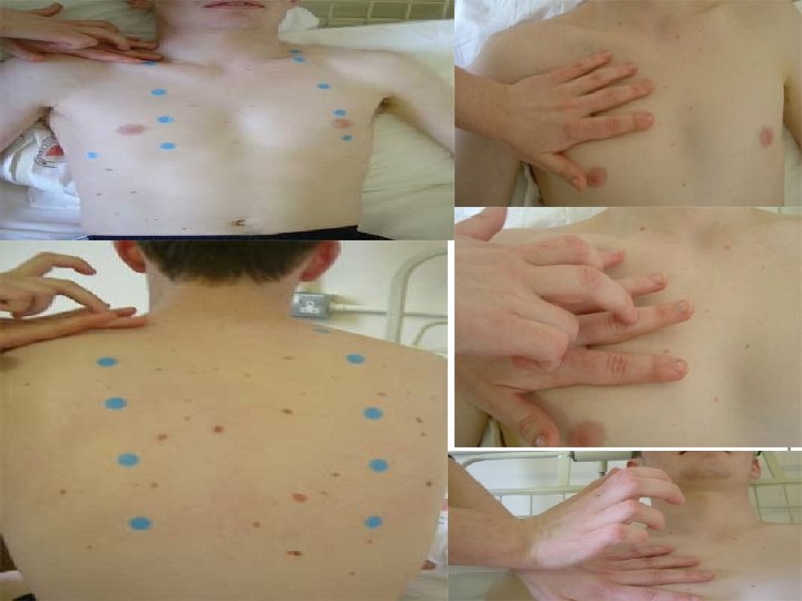 Assessing chest expansion in expiration (left) and inspiration (right). Percussion over the anterior chest. Direct percussion of the clavicles for disease in the lung apices