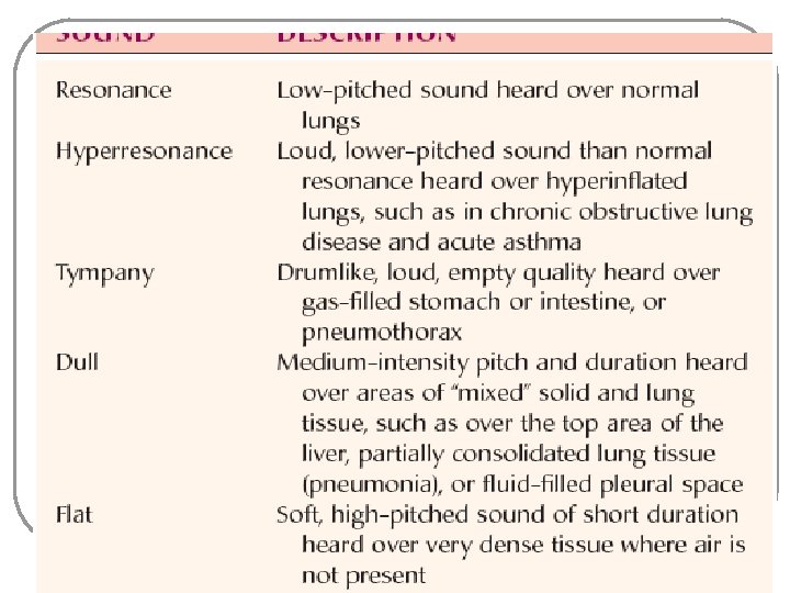 Normal Breath Sounds l l Bronchial : Heard over the trachea and mainstem bronchi (2 nd-4 th intercostal spaces either side of the sternum anteriorly and 3 rd-6 th intercostal spaces along the vertebrae posteriorly). The sounds are described as tubular and harsh. Also known as tracheal breath sounds. Bronchovesicular : Heard over the major bronchi below the clavicles in the upper of the chest anteriorly. Bronchovesicular sounds heard over the peripheral lung denote pathology. The sounds are described as medium-pitched and continuous throughout inspiration and expiration. Vesicular : Heard over the peripheral lung. Described as soft and low- pitched. Best heard on inspiration. Diminished : Heard with shallow breathing; normal in obese patients with excessive adipose tissue and during pregnancy. Can also indicate an obstructed airway, partial or total lung collapse, or chronic lung disease.